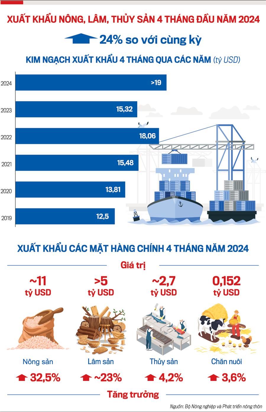 Theo số liệu từ Bộ Nông nghiệp và Phát triển nông thôn, trong 4 tháng đầu năm 2024, xuất khẩu nông sản đạt được những kết quả đáng mừng:
