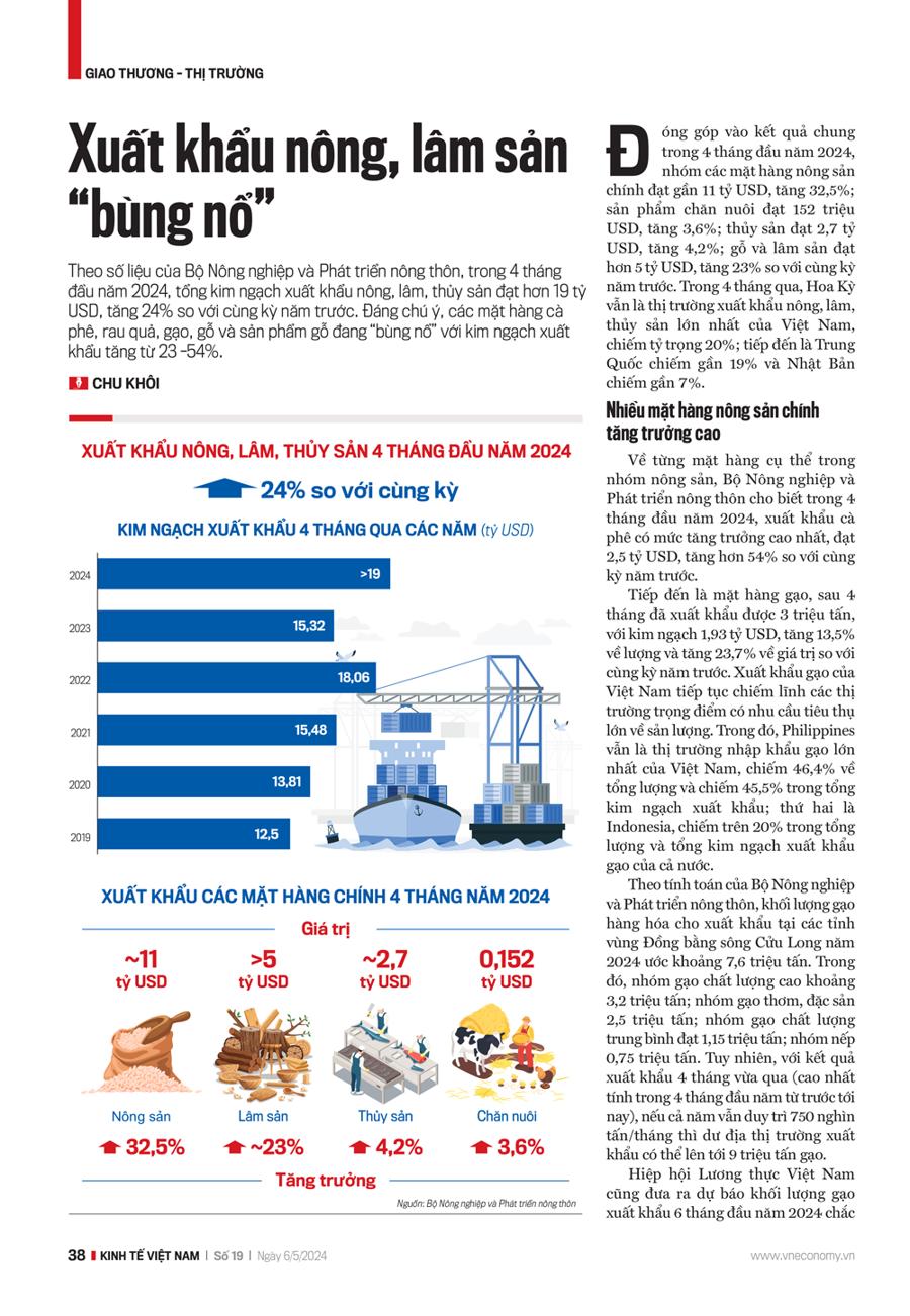 Thị trường xuất khẩu nông sản của Việt Nam ngày càng được mở rộng. Trong 4 tháng đầu năm 2024, Hoa Kỳ tiếp tục là thị trường lớn nhất, chiếm 20% tổng kim ngạch, tiếp theo là Trung Quốc (19%) và Nhật Bản (7%).